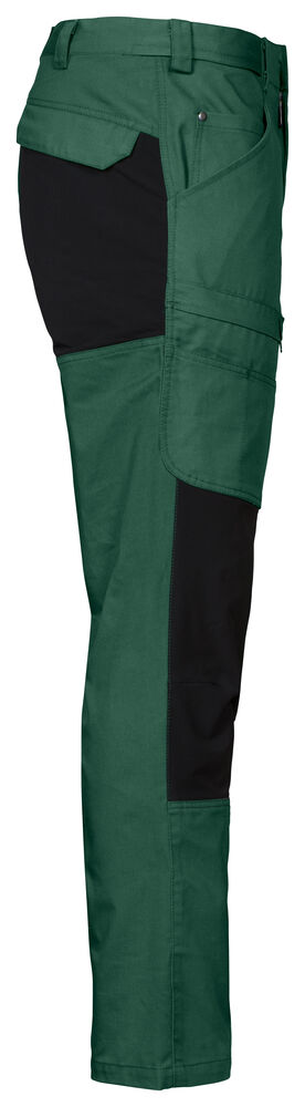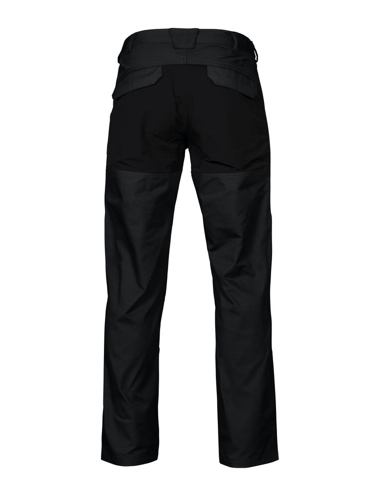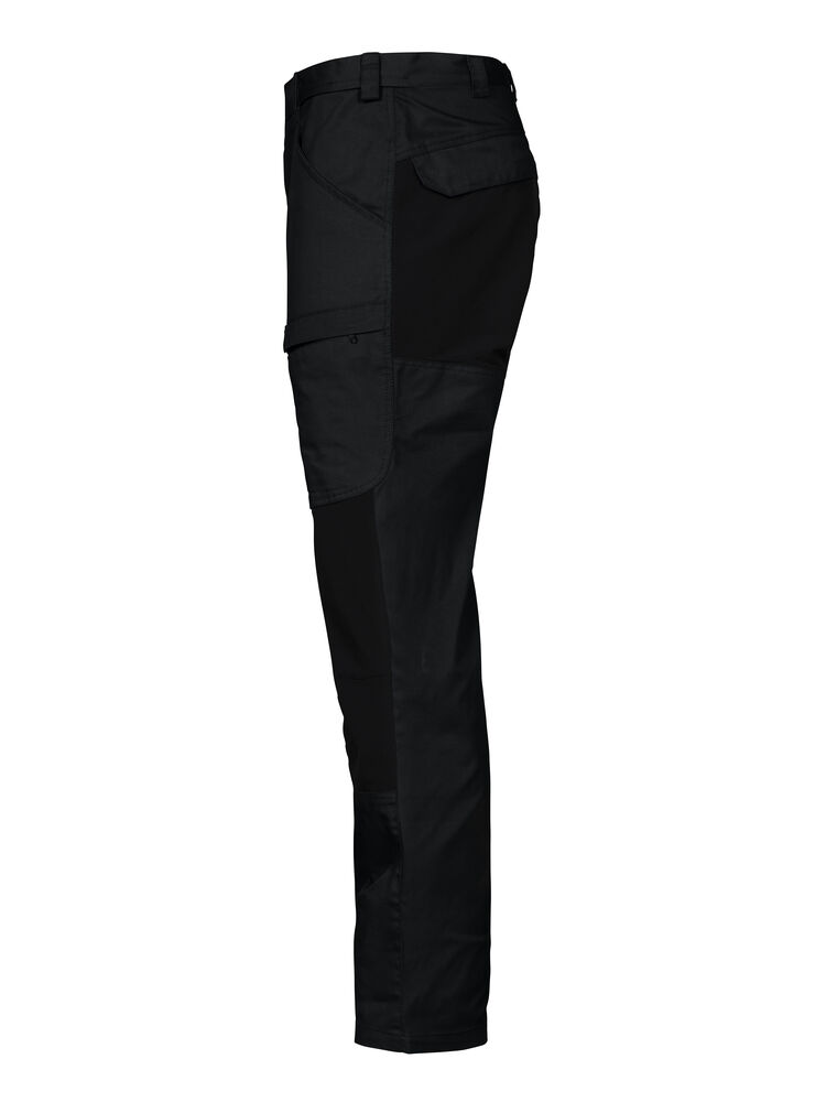 Servicebukse med stor fleksibilitet. Stretchstoff over sete, skritt og knær gir ekstra bevegelsesfrihet. Benlommer med glidelås, den venstre med innvendig telefonlomme og den høyre med innvendig hempe for ID-kort. Bredere belteløkke bak for å hindre press fra beltet. Baklommer med klaff og borrelås. Skjult feste for hylsterlommer (ref. artikkel 9042). Skjult knapp i front.
