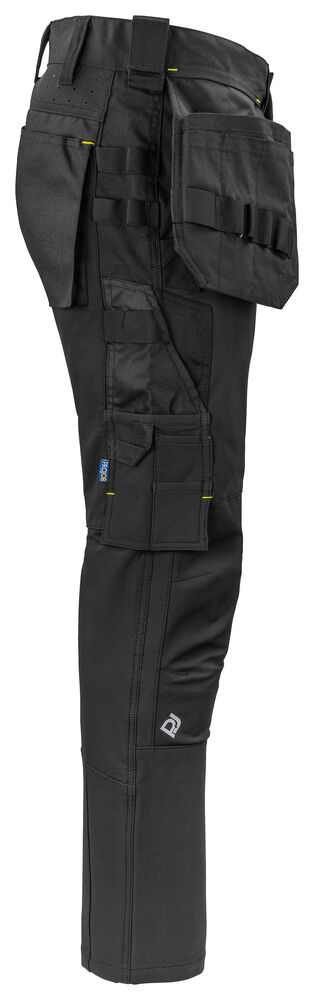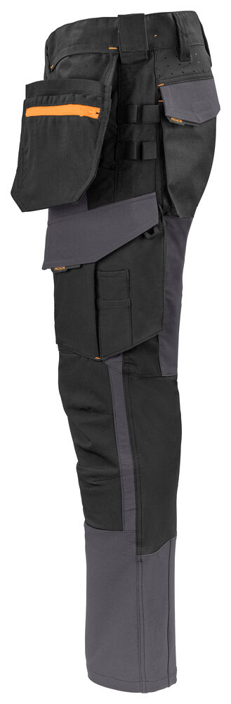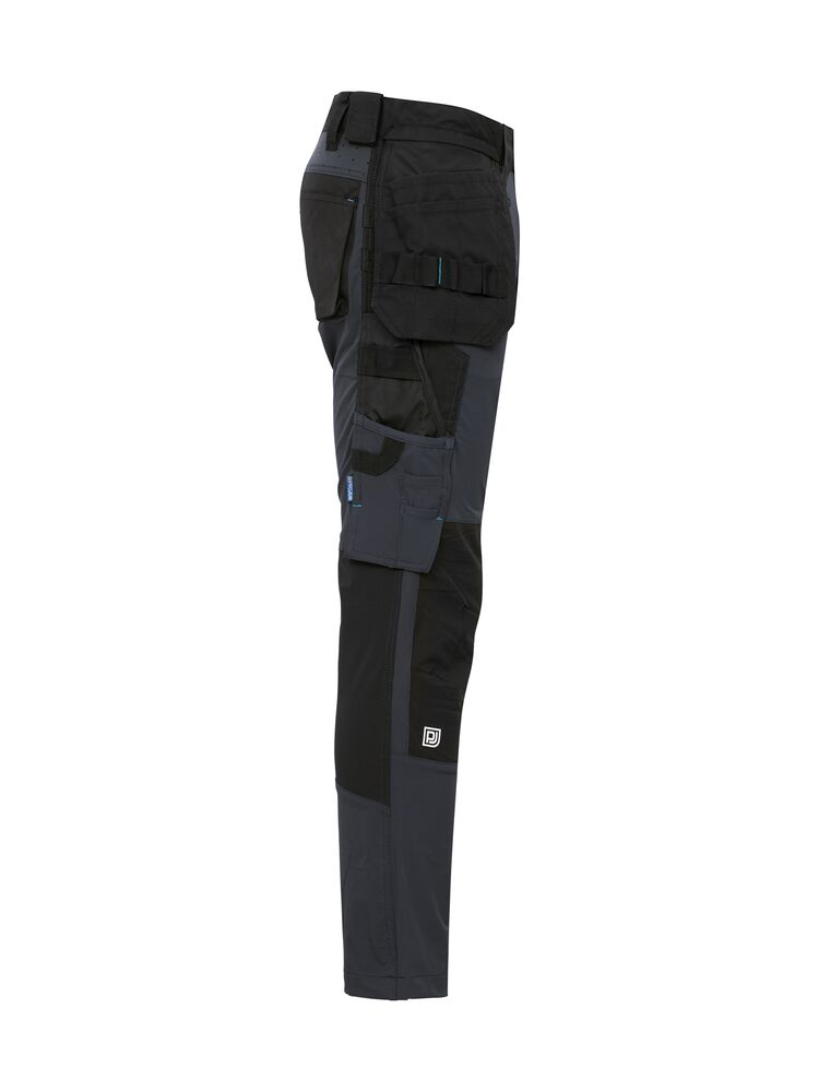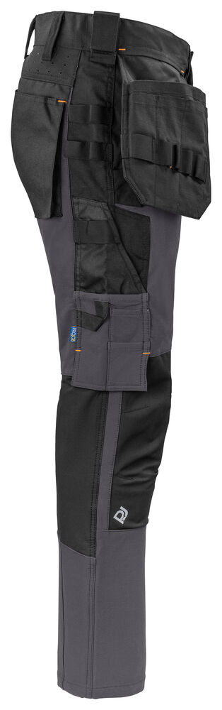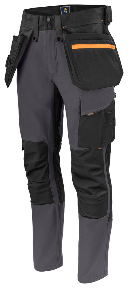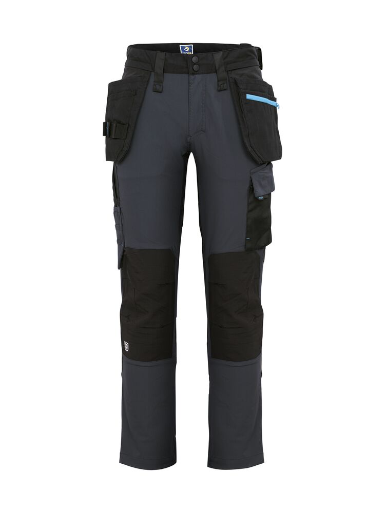 Arbeidsbukse i full stretch som gir maksimal bevegelsesfrihet. Moderne passform. Sidene på toppen er ikke i stretch – dette for å gi buksen bedre stabilitet. Hengelommer med Cordura® forsterket innside, hvorav den ene med glidelås. Hengelommene kan fjernes ved å sprette en kontrastfarget, skjult tråd. Ventilasjon bak i midjen. Benlommer på venstre side med plass til verktøy og penn, samt en mobiltelefonlomme med magnetlås og brakett for ID -kortholder. På høyre side er det en tommestokk- og verktøylomme med knivknapp. Braketter for verktøyholdere. Baklommer i Cordura®, en med klaff med magnetlås. Forbøyde knær med knebeskyttelseslommer som kan justeres i to høyder, åpnes fra innsiden. Benavslutningene er forsterket på innsiden med Cordura®, knærne er forsterket med Cordura® -stretch for maksimal holdbarhet og bevegelsesfrihet. Mulighet for å feste MOLLE -systemer på begge sider.