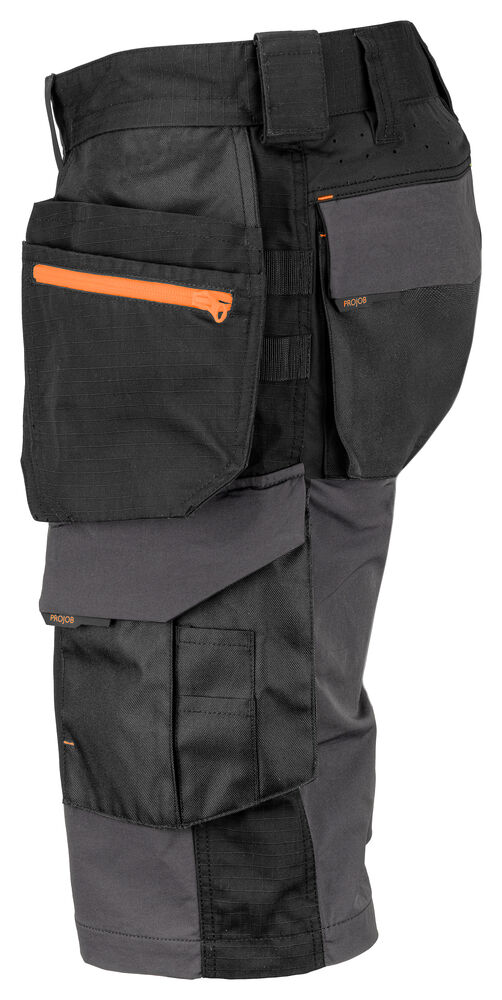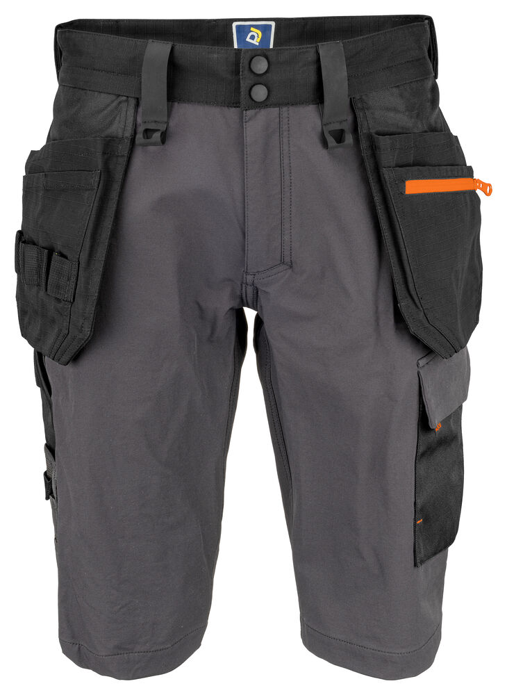 Shorts i full stretch som gir maksimal bevegelsesfrihet og komfort. Moderne passform. Sidene øverst er ikke i stretch for å gi stabilitet til buksen. Hengelommer med Cordura®-forsterket innside, hvorav den ene har glidelås. Hengelommene kan fjernes ved å sprette opp en kontrastfarget, skjult tråd. Ventilasjon bak i midjen. Benlommer, på venstre side med plass til verktøy og penn, samt mobillomme med magnetlås og feste for ID-kortholder. På høyre side er det tommestokk- og verktøylomme med knivknapp. Fester for verktøyholdere. Baklommer i Cordura®, en med lokk med magnetisk lukking. Mulighet for å feste MOLLE-system på begge sider.