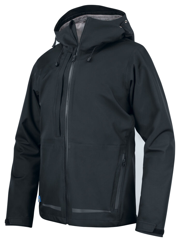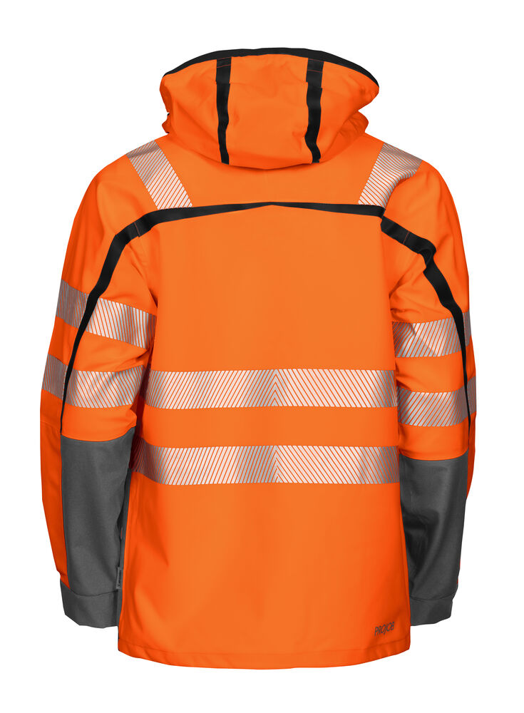 3-lags vind og vanntett jakke med teipede sømmer, avtag-bar hette og transferreflekser. Justerbar i enden med snor. Tre laminerte lommer med vanntett glidelås, en på venster underarm og to brystlommer, den venstre med hempe for ID-kortholder. Fleecefôrede sidelommer med glidelås og to store lommer med klaff. Dobbel vinklaff i front med toveis glidelås. Forbøyde armer med justerbar avslutning.Innerjakke 646444 passer som for, og kan kjøpes seperat. EN ISO 20471 Klasse 3