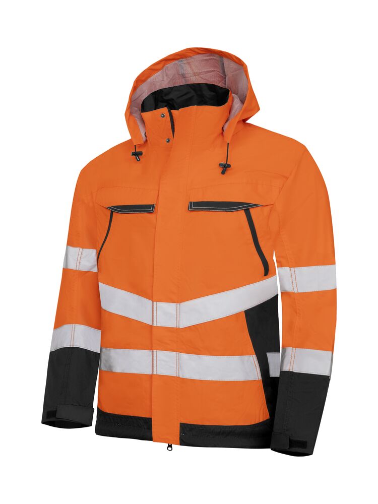 Vind- og vanntett skalljakke med tapede sømmer. Gode pusteegenskaper. To brystlommer og to frontlommer med glidelås. D-ring i venstre brystlomme til ID-kort. Tre innerlommer. Avtagbar hette med regulerbar snor. Regulerbare armavslutninger.ENISO 20471 Klasse 3.