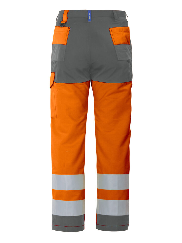 Arbeidsbukse med ”flat front”. Sidelommer i front, sikkerhetslomme med glidelås på høyre side. To benlommer med pennerom, venstre med plass for mobil. Tommestokkslomme. Polyamidforsterkninger i framkant av lommene, nedre del av baklommene, forsterket kant på tommestokklomme, penn- og polyamidforsterkning i nedre del av Benlomme og i nederkant bak av bukse. Knebeskyttelseslommer på innsiden. Hemper under baklommer og benlommer å feste Inbags i. Maks 50 vask i 60°C.ENISO 20471 Klasse 2
