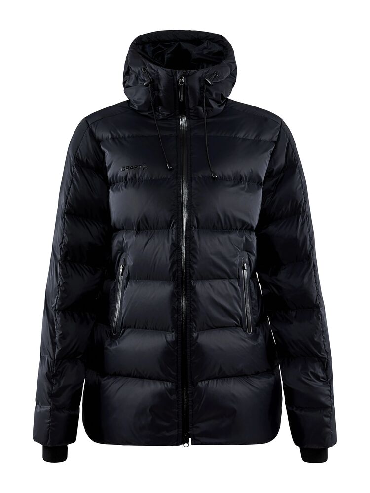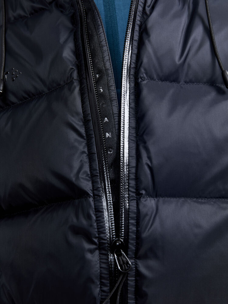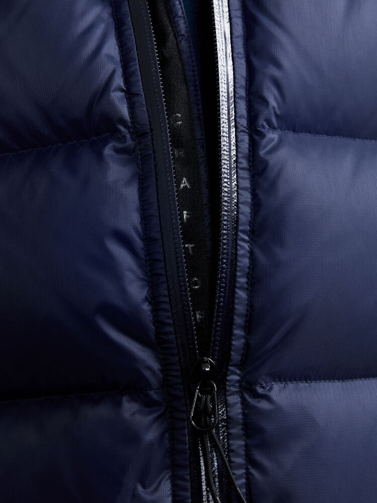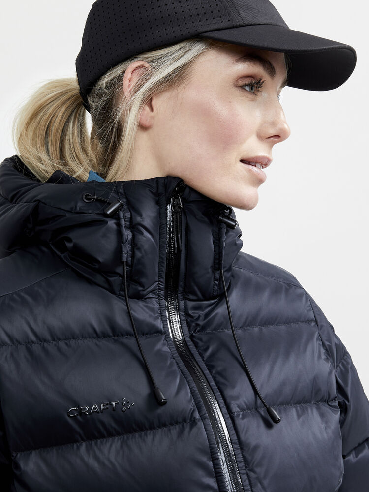 Varm dunjakke til dame, laget av resirkulert materiale. Dunjakken er designet for å holde deg god og varm på kalde dager. Jakken har høy krage, vannavvisende 2-veis glidelås i front, to sidelommer med vannavvisende glidelåser, innerlomme med glidelås, justerbar snøring i nederkant og hette, samt mansjetter i ermene som holder kald vind ute. • Vannavvisende 2-veis glidelås i front• To sidelommer med vannavvisende glidelåser• Varm og høy krage• Justerbar snor i nederkant og i hette• Innerlomme med glidelås• To åpne innerlommer med elastisk strikk• Mansjetter for å hindre at vind kommer inn i ermet• Craft-logo på høyre bryst