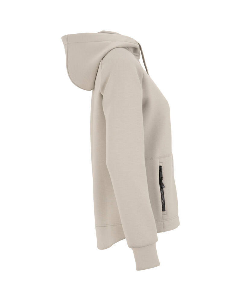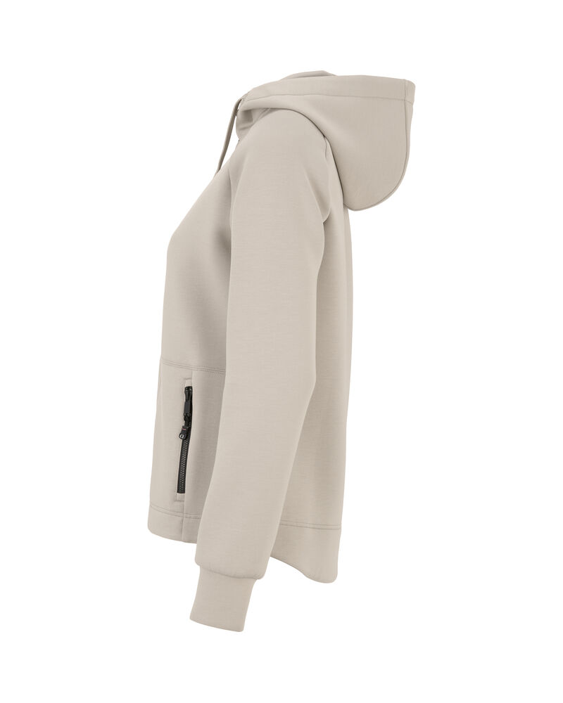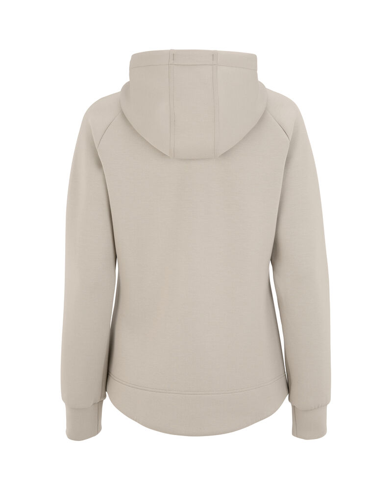 Hettegenser laget i et dobbeltstrikket materiale med ekstra stretch. Hettegenseren er laget av et blandemateriale med bl. annet sertifisert resirkulert polyester. Sydde mansjetter i nederkant og ermeavslutninger. Formsydd hette med doble sømmer og snøring. Glidelås som går opp i kragen og frontlommer med dekorative, sorte glidelåser. Hettegenseren har raglanermer og litt lengre rygg, noe som gir en svært god passform. Noe innsvinget modell.