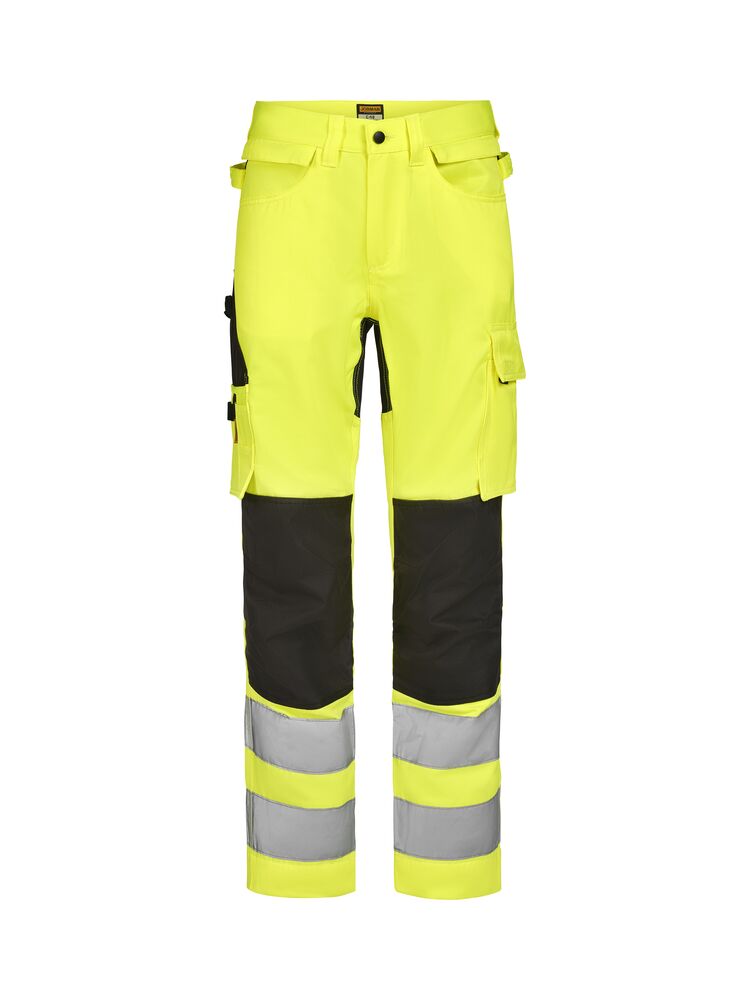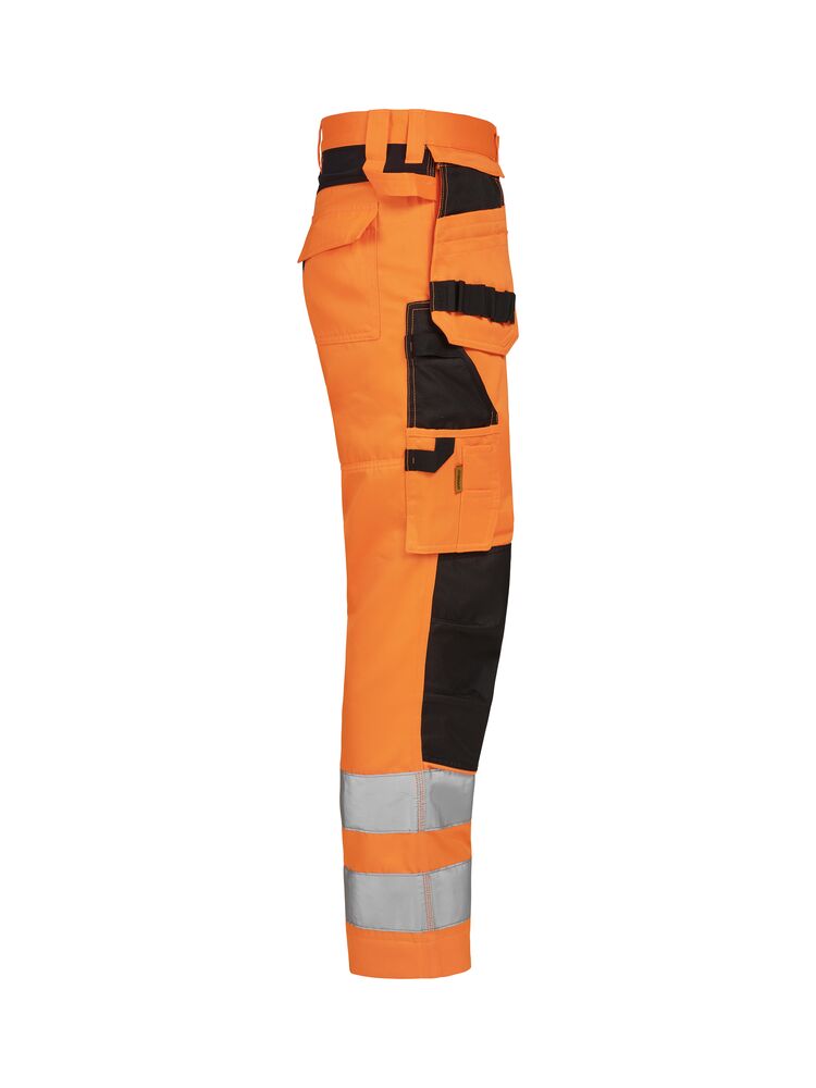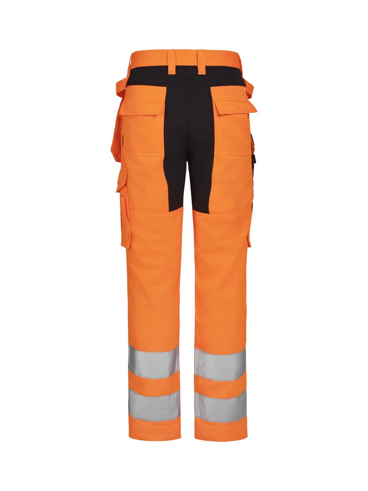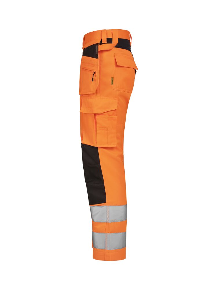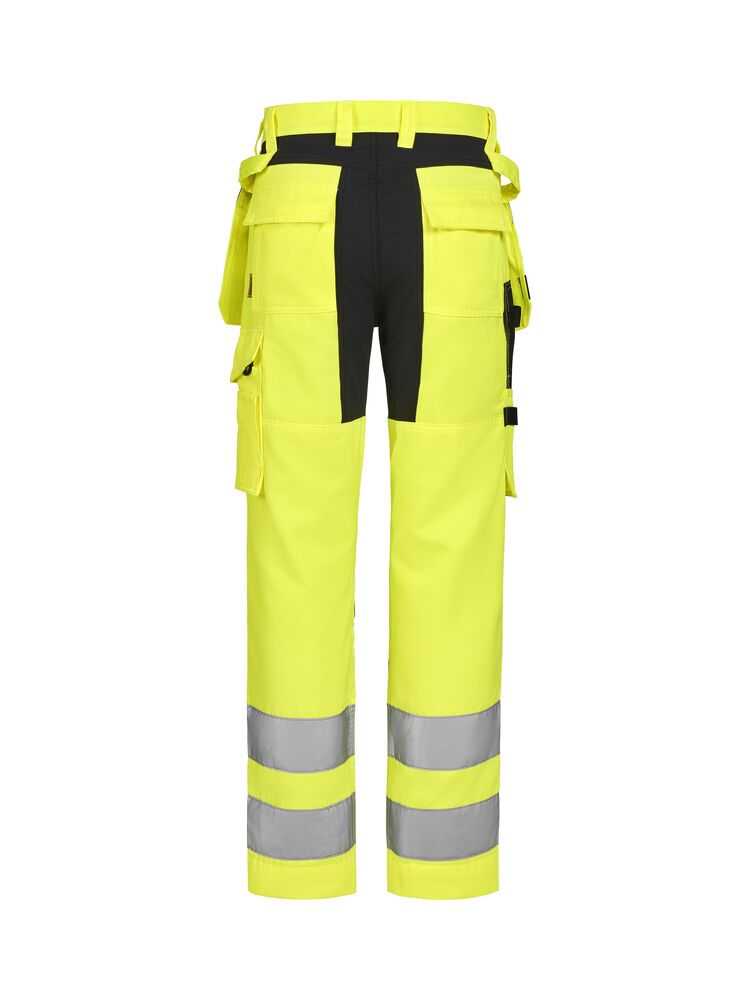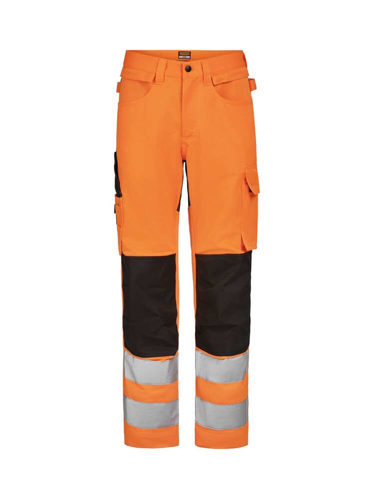 Lettstelte bukser med høy synlighet i slitesterk polyester/bomull som beholder farge og form selv etter gjentatte vask. Stretchpaneler bak gir økt bevegelighet og komfort. Avtagbare hengelommer med glidelås, ekstra rom og ekstra glidelåslomme for sikker oppbevaring. Baklommer med klaff. Benlomme med ekstra rom og klaff med borrelås. Tommestokk-lomme med knivrom. Forsterkede knebeskytterlommer med mulighet for å plassere knebeskyttere i to forskjellige høydeposisjoner for optimal passform. Buksene kan forlenges med 5 cm ved å brette ut en fold nederst på beinet. Sertifisert i synlighetsklasse 2 i henhold til EN ISO 20471.
