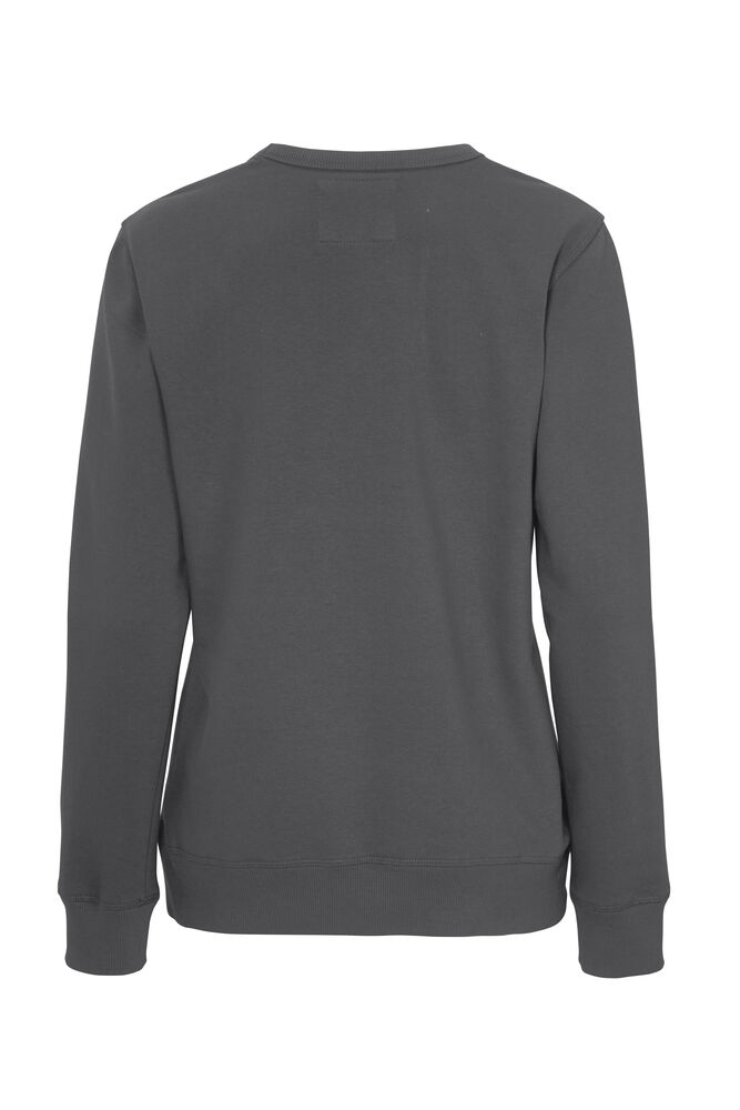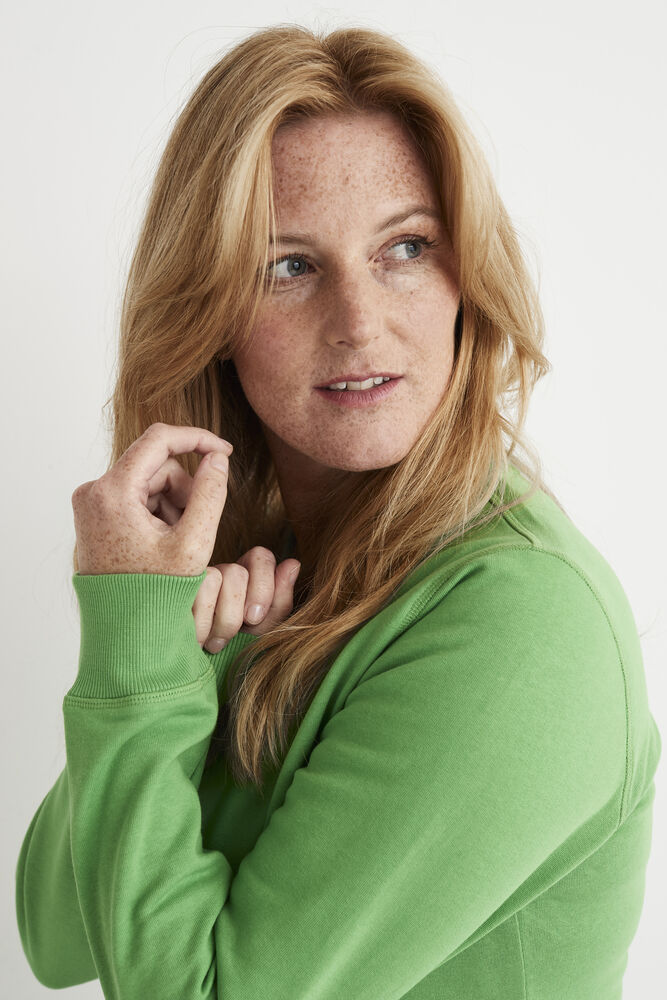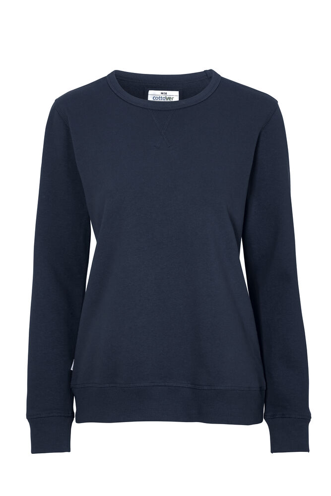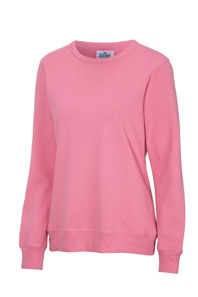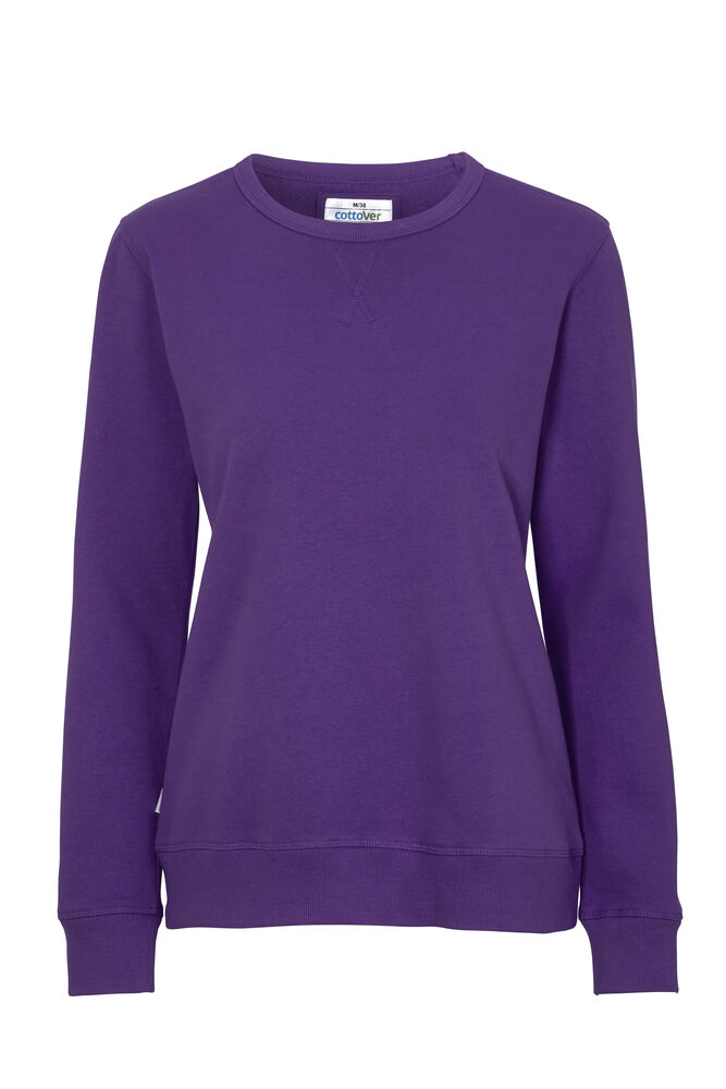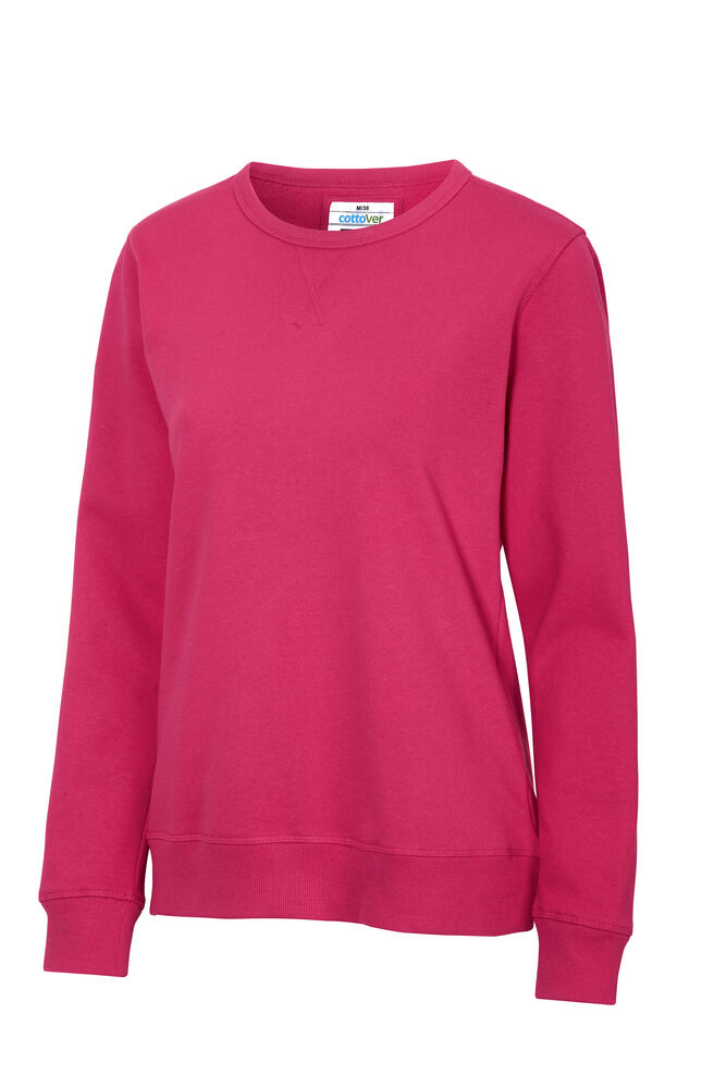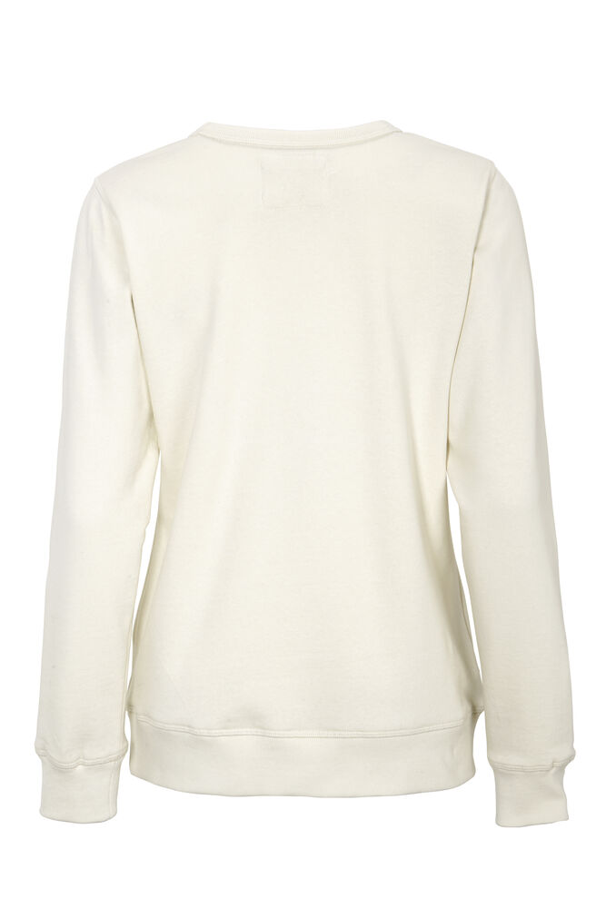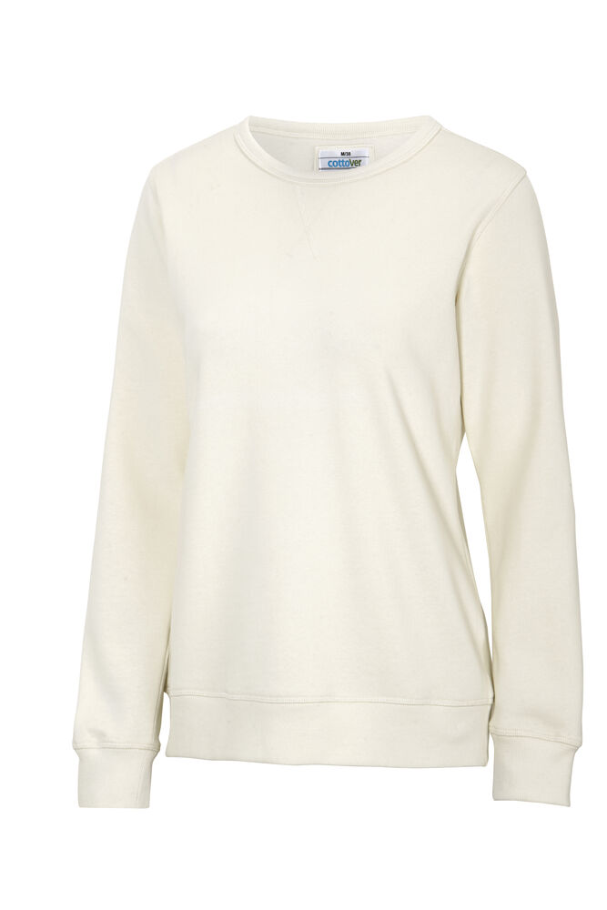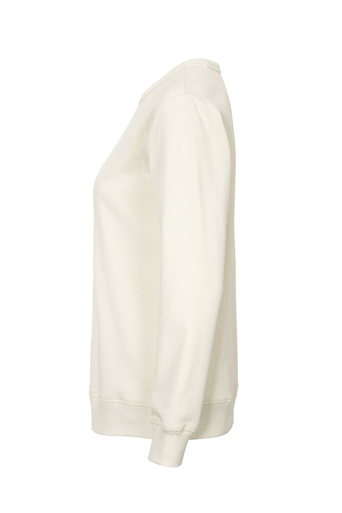Rundhalset genser med børstet innside. Damemodell. 2×2 ribbestrikk rundt hals, ermeavslutning og nederkant. Dekorative ton-i-ton sømmer i overlock.