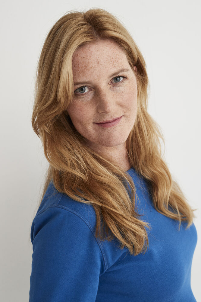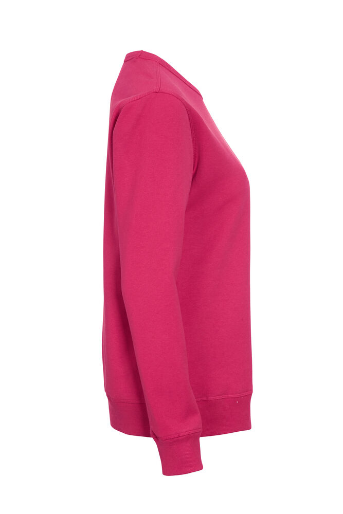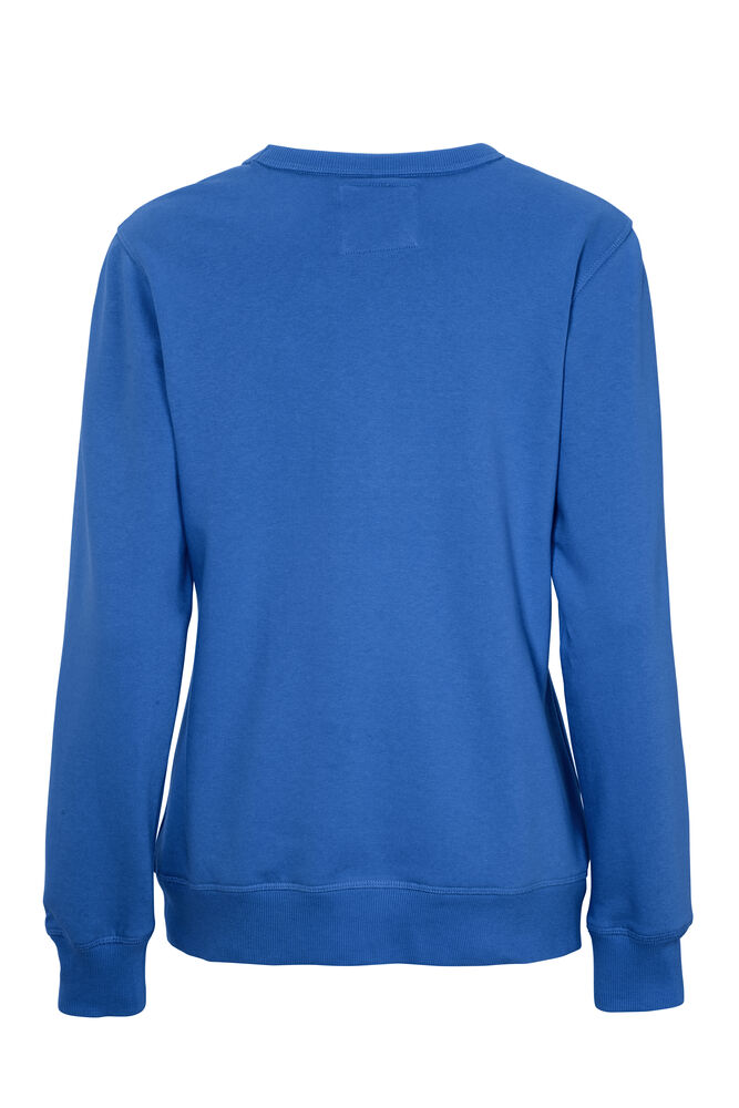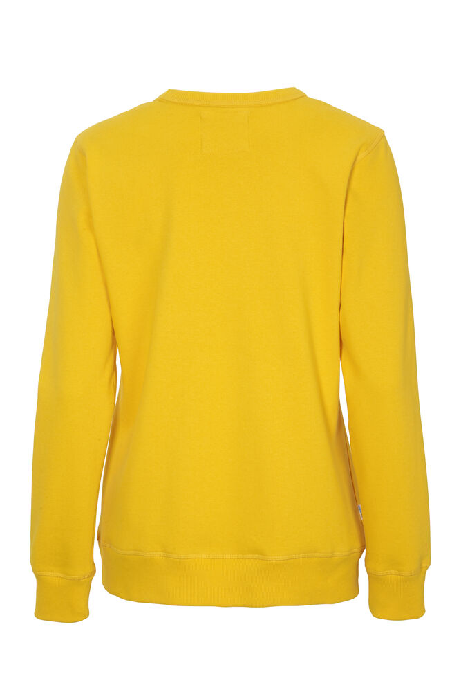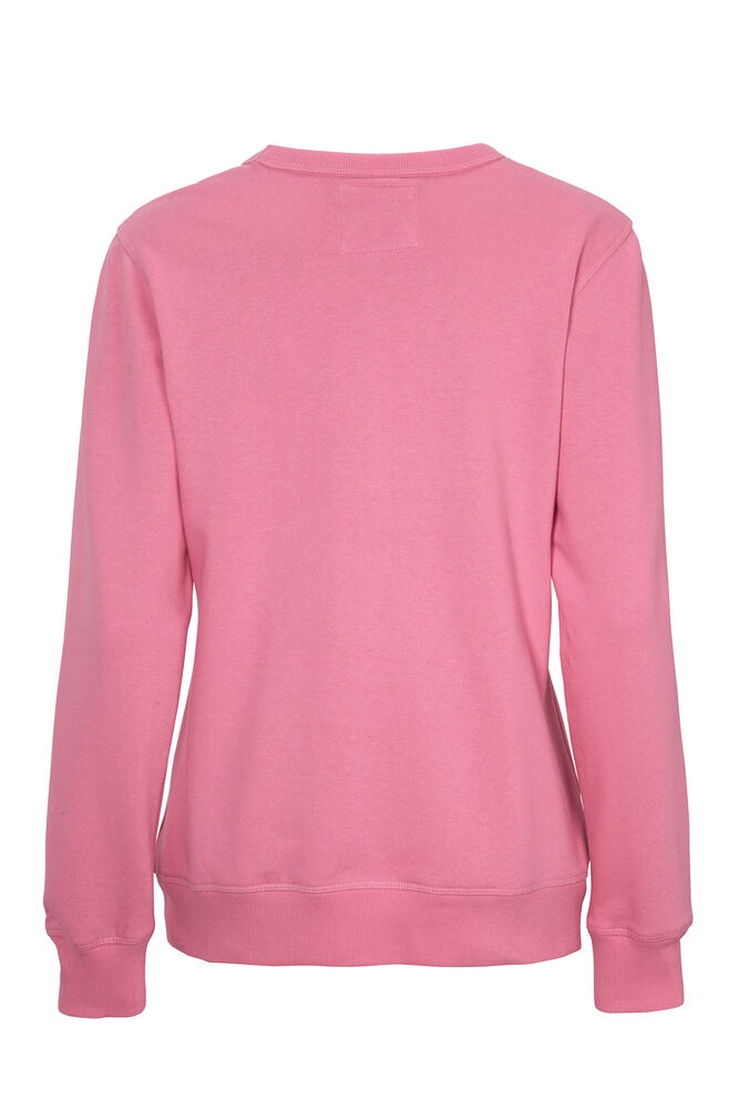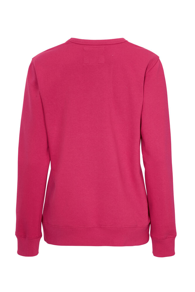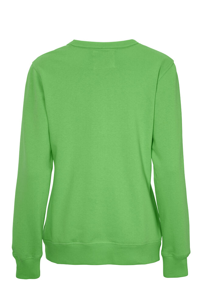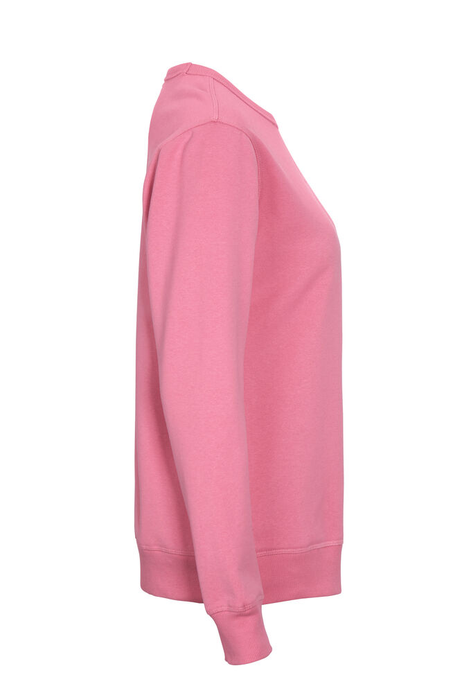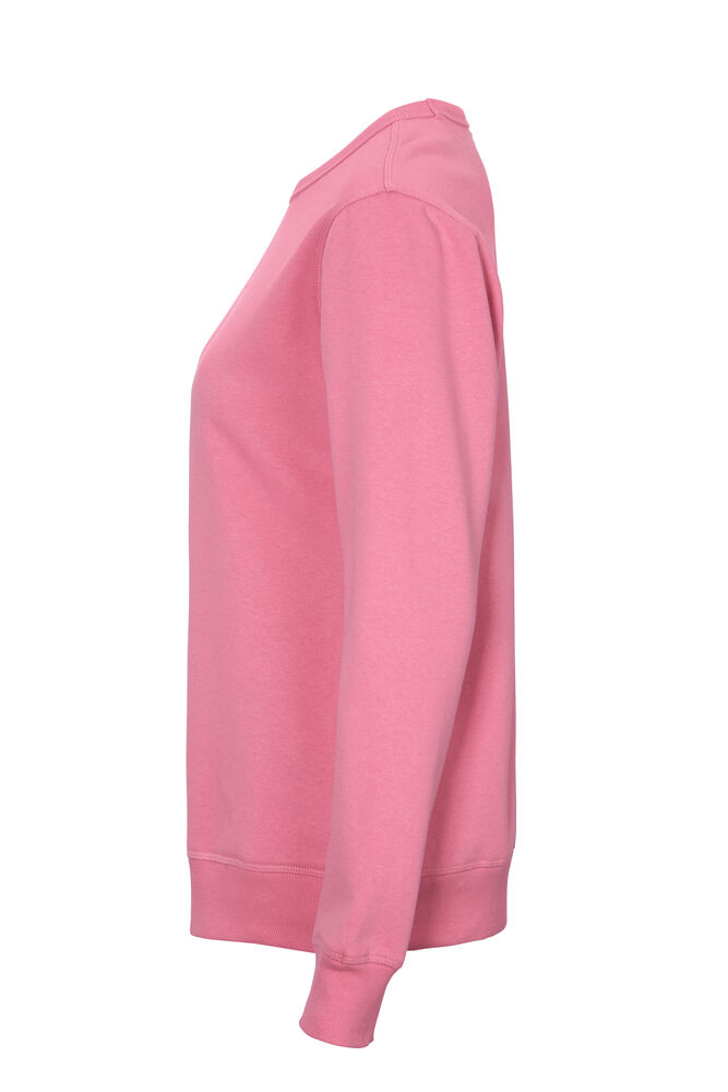 Rundhalset genser med børstet innside. Damemodell. 2×2 ribbestrikk rundt hals, ermeavslutning og nederkant. Dekorative ton-i-ton sømmer i overlock.