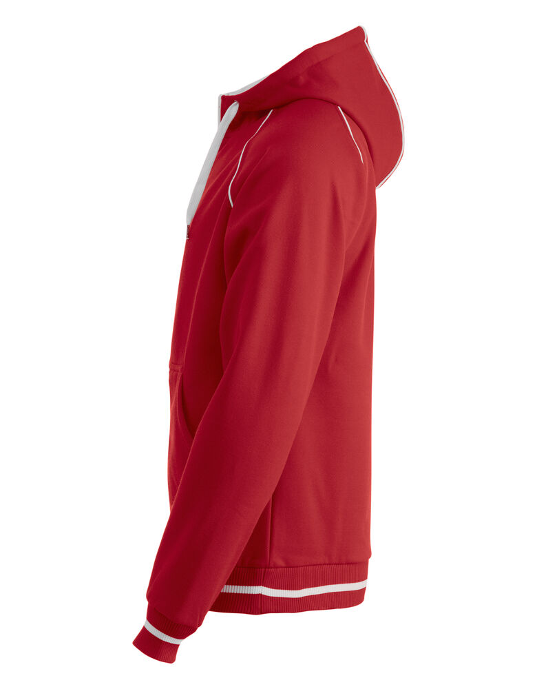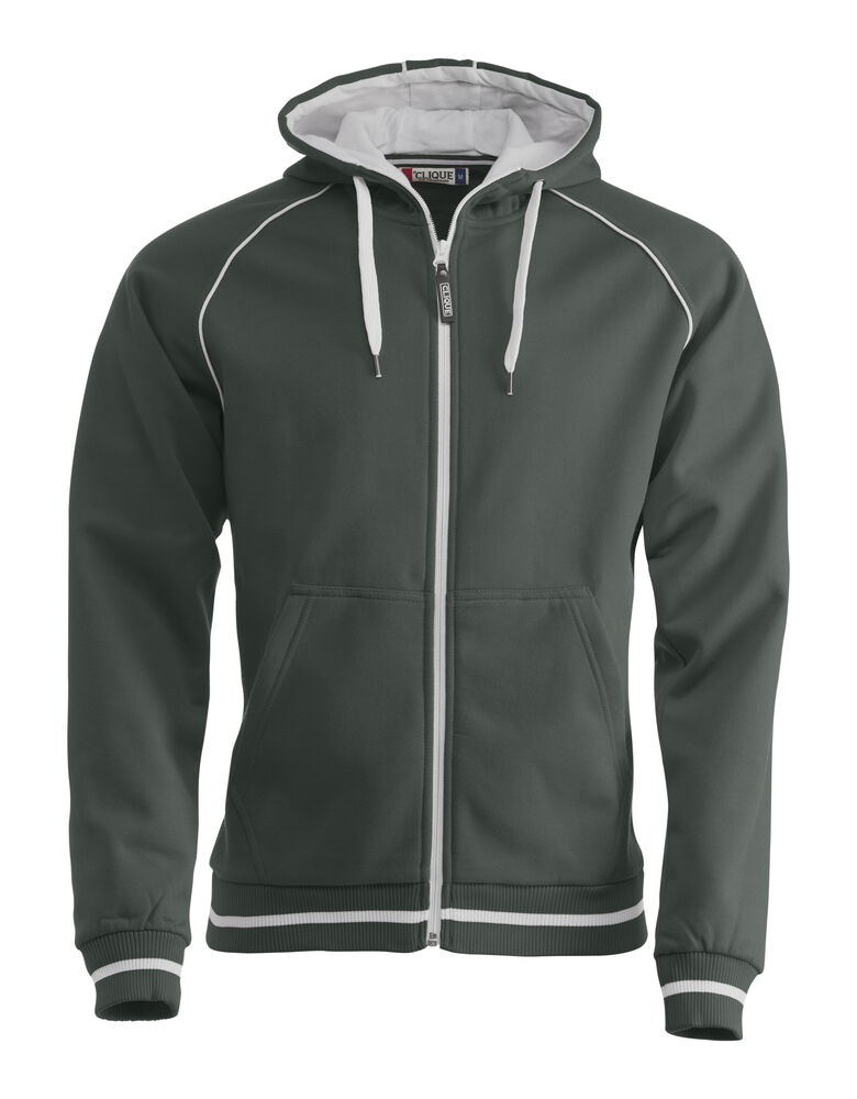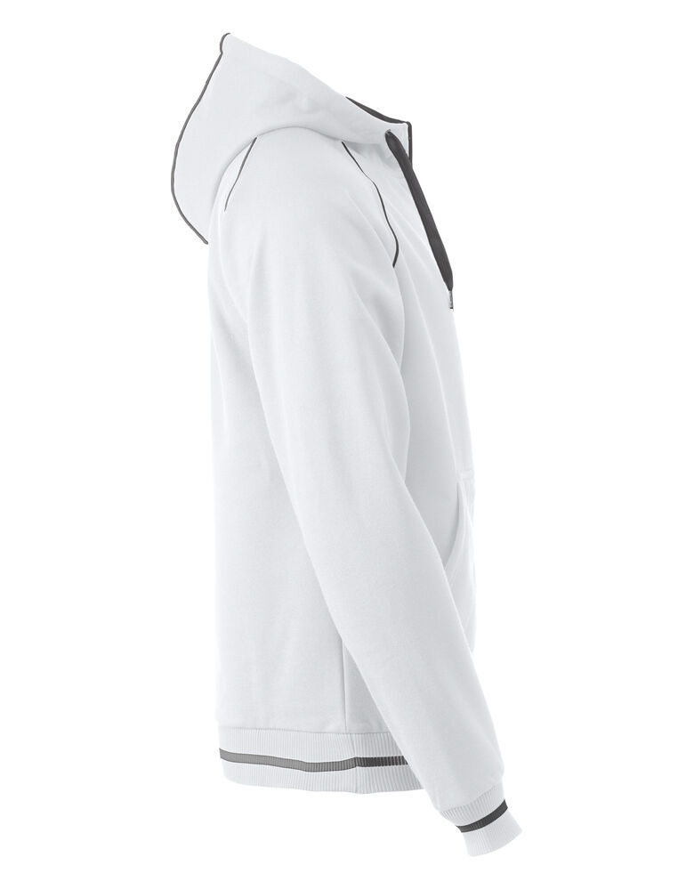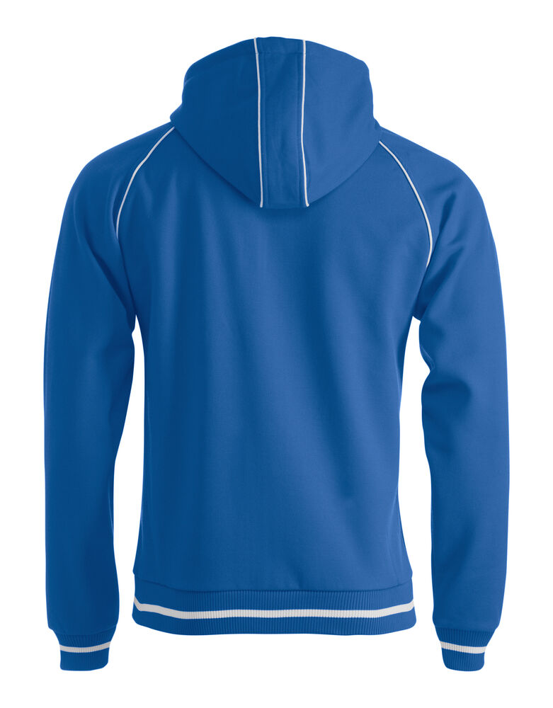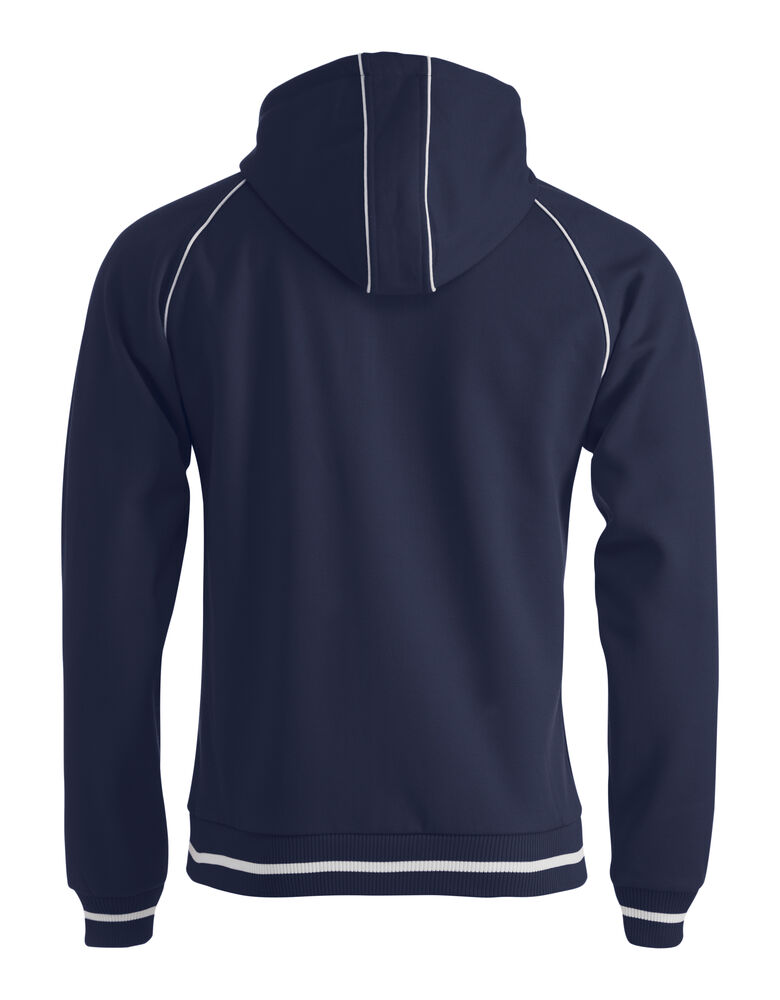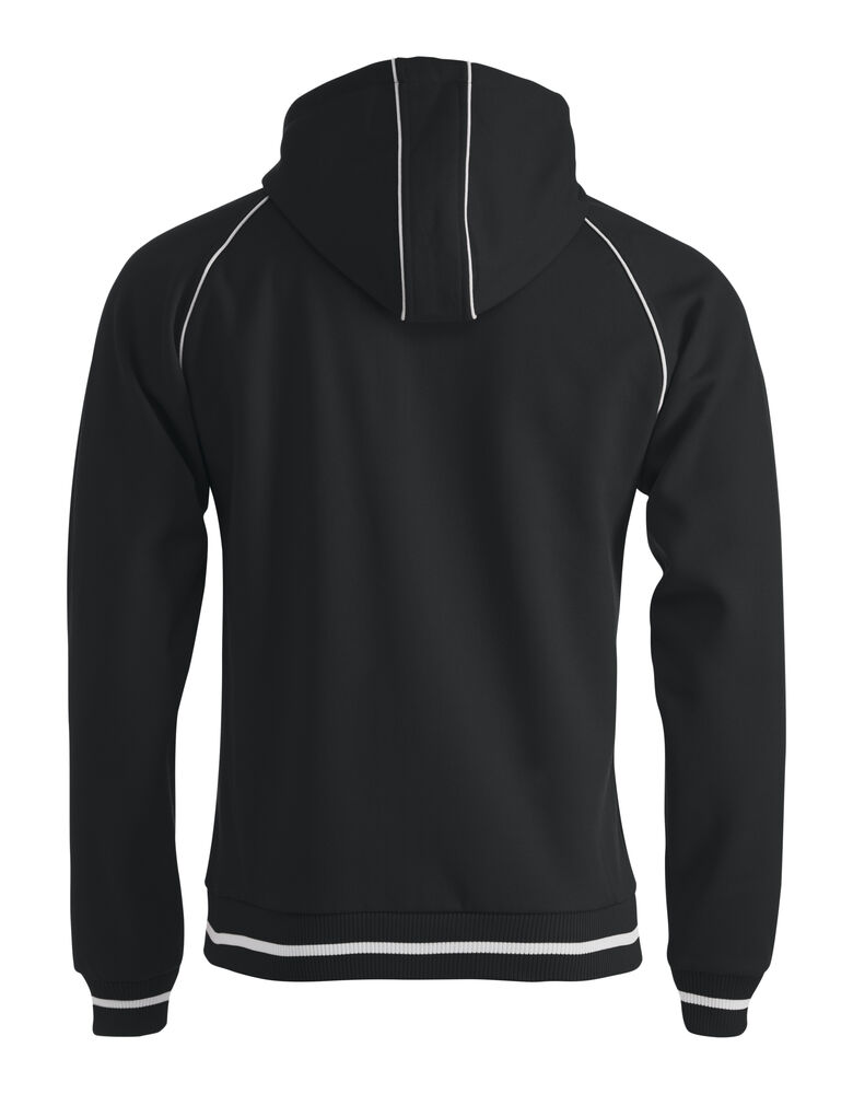 Sweatshirt jakke med hette til herre, børstet innside og strikket struktur på utsiden. Hette er med fõr og glidelås for dekorasjon. Kontrast farge på innside hette, piping, stripe på ribb og glidelås i front.