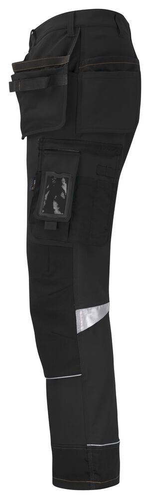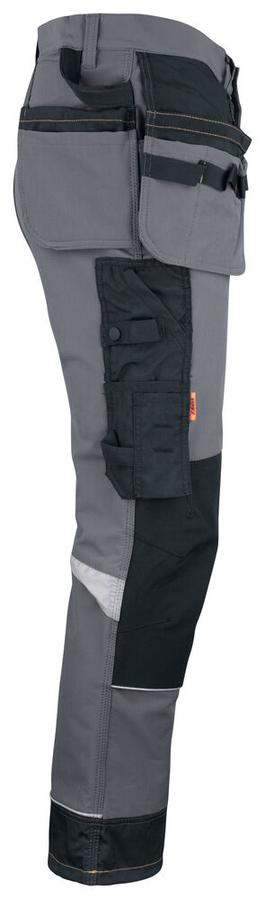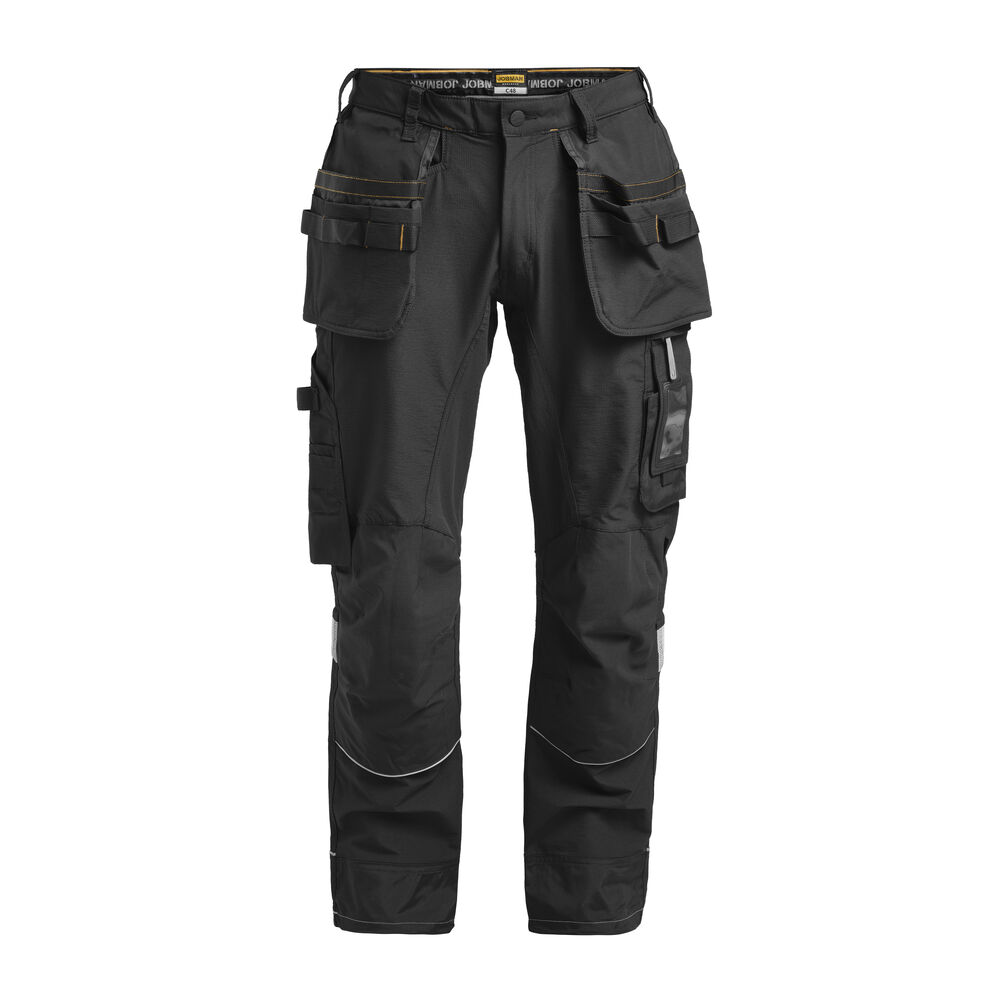 Smidig 4-veis stretch i slitesterkt ripstop-materiale. Romslige hengelommer med ekstra rom og forsterket innside; kan puttes i frontlommene. Silikonbånd i bukselinningen holder buksen på plass. Forsterket stretch Cordura® i skrittet. Delvis fritthengende baklommer gjør at det lettere å få tak i innholdet. Ekstra beltehemper på de største størrelsene. Hammerhank. Tommestokklomme med knivholder. Benlomme med skjult glidelås, ID-kortholder og mobiltelefonlomme. Forbøyde knær med knebeskyttelseslommer i stretch Cordura® med 3Ms refleksbiser og to høyder. Mesh i knefolden for ventilasjon. Forsterket benkant i polyamid som ikke absorberer fukt. Refleksbise og innstramming nede på benet. Sertifisert ifølge EN 14404:2004+A1:2010 type 2, nivå 1 sammen med Jobmans knebeskytter 9943, 9944 og 9945.