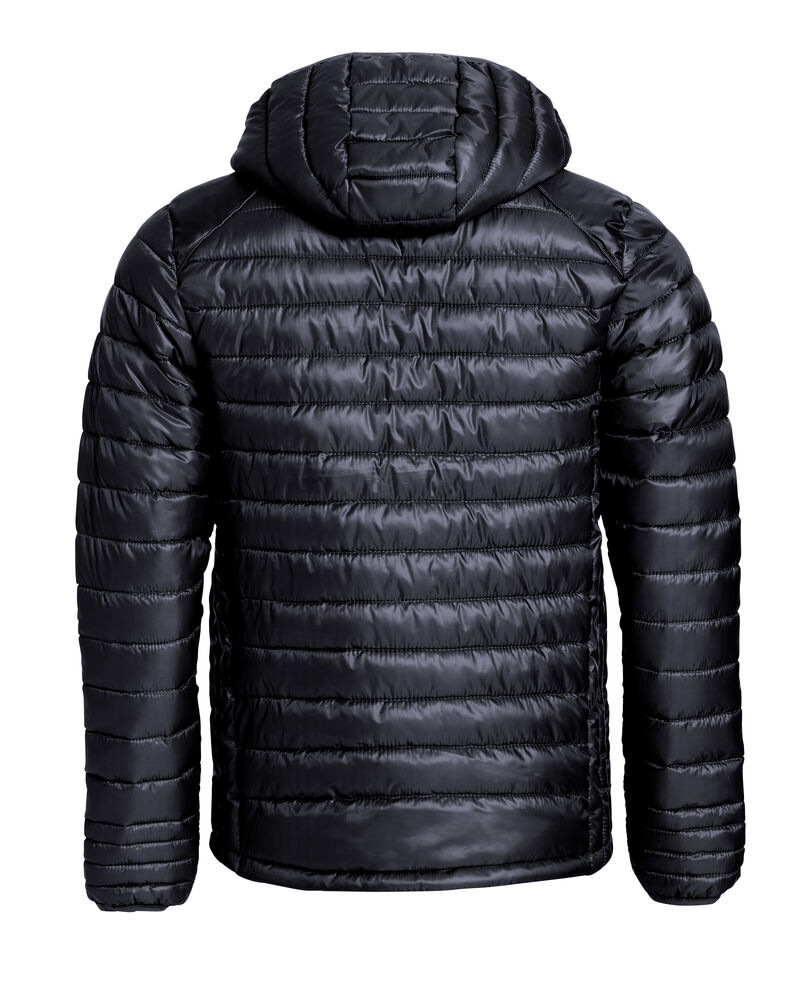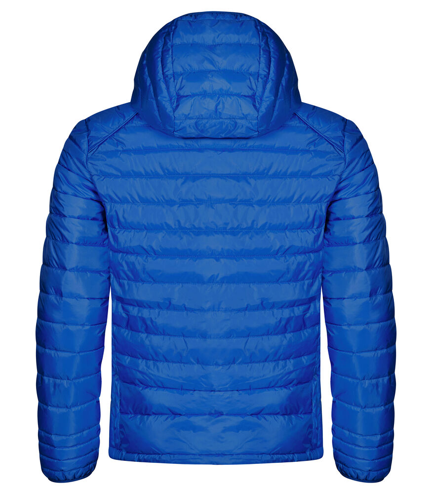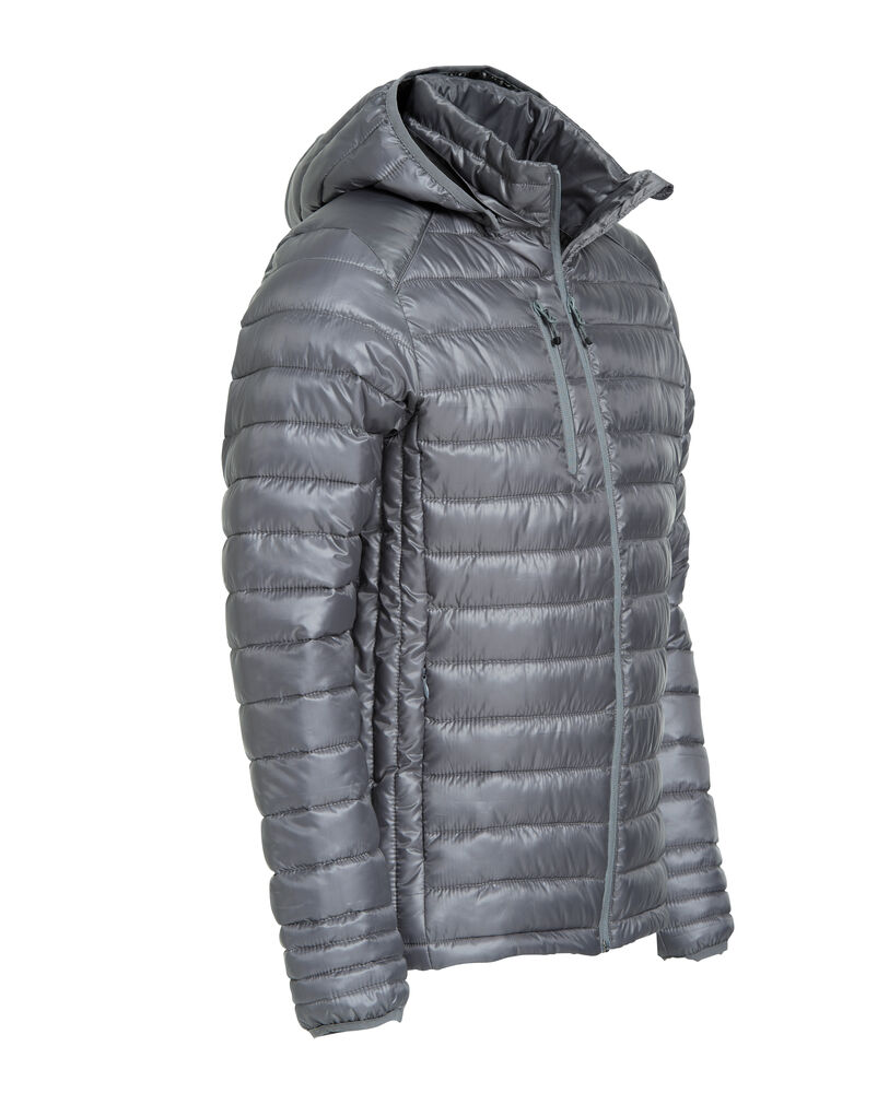 Moderne jakke i fuskedun. Avtagbar hette og tre utvendige lommer med glidelås. To innvendige lommer. Tilpasset for hodetelefoner.