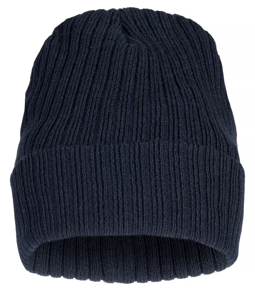 Ribbestrikket lue med brett og fire sømmer øverst.