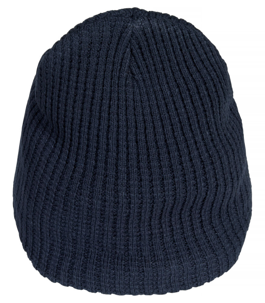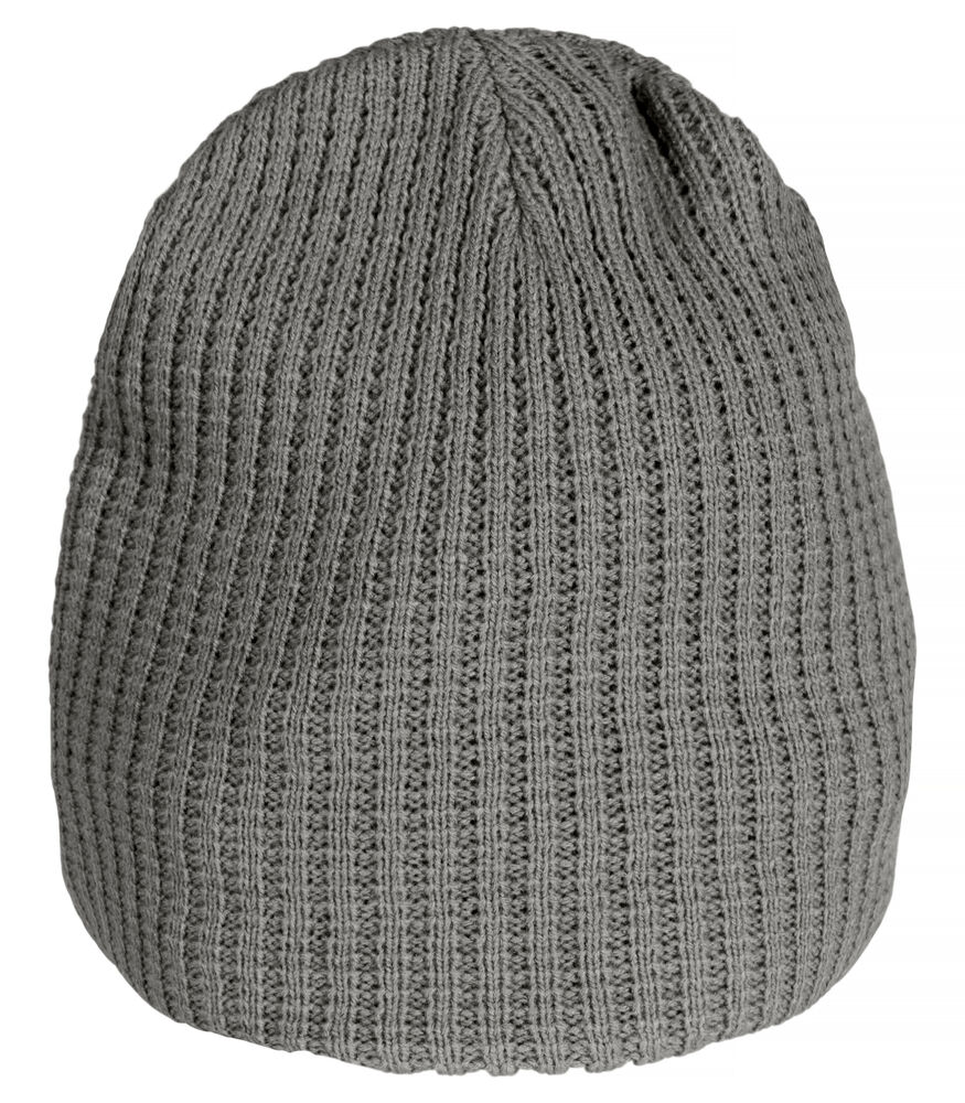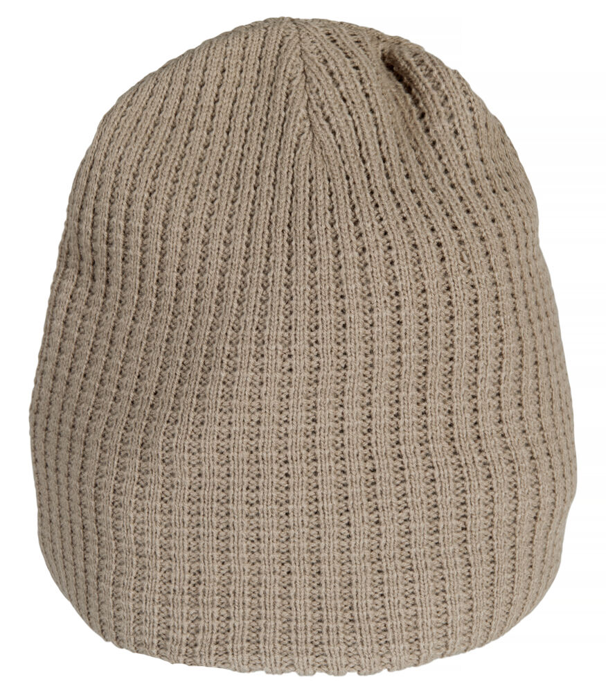 Dobbel strukturstrikket lue med fire sømmer øverst.