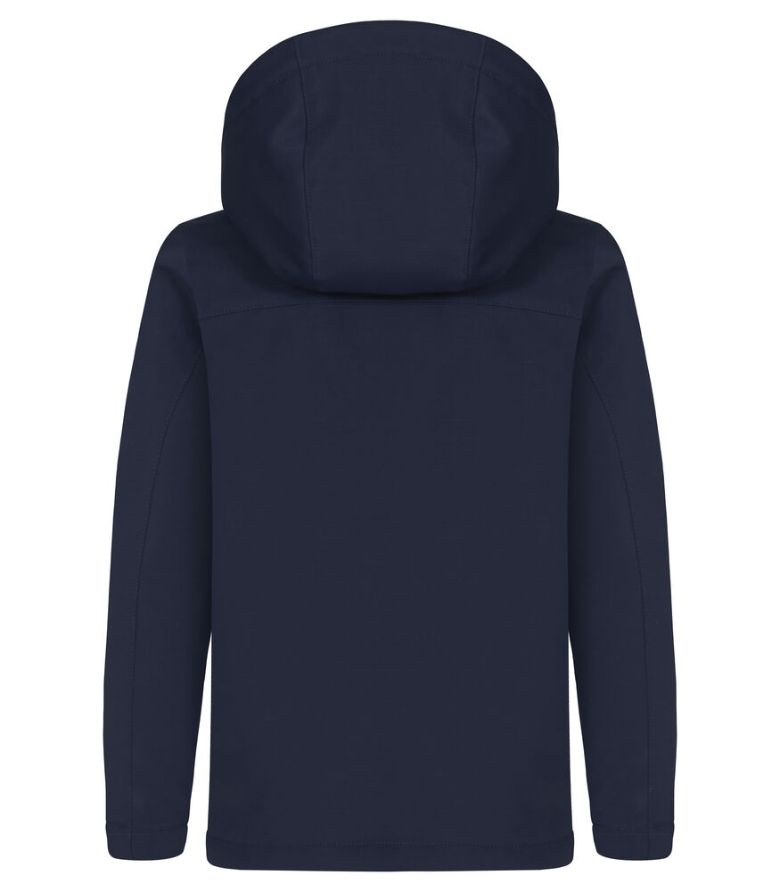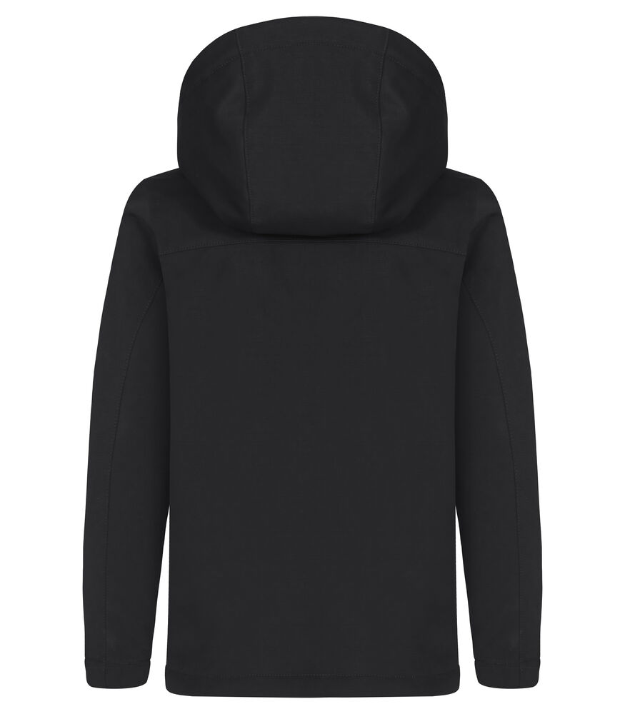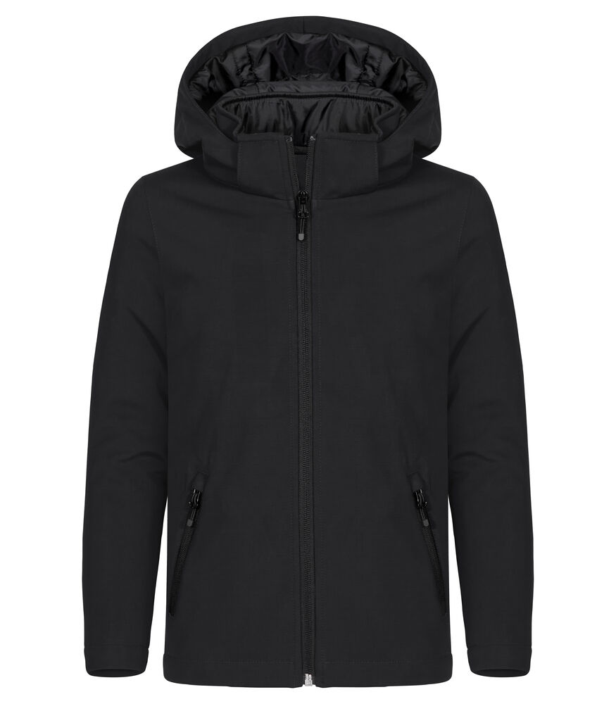 En vattert softshelljakke med avtagbar, barnesikker hette. Jakken har to utvendige lommer med reverserte SBS-glidelåser, en lett avtagbar etikett for rebranding, samt svart fôr med glidelås for å forenkle brodering på jakken.