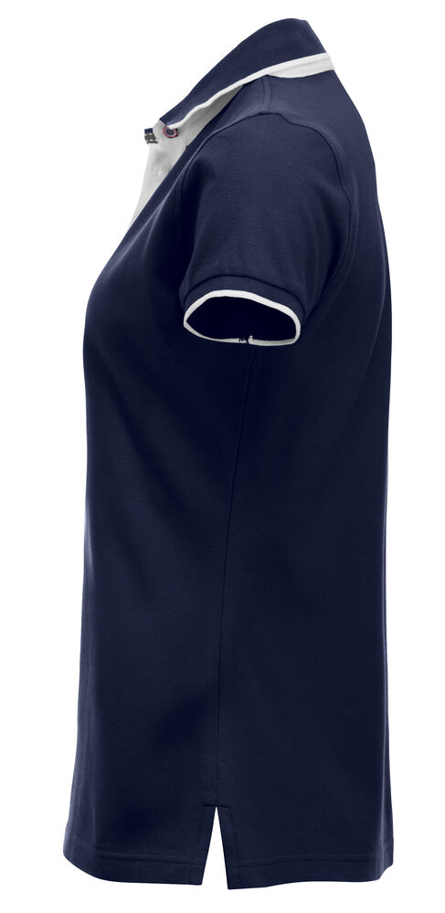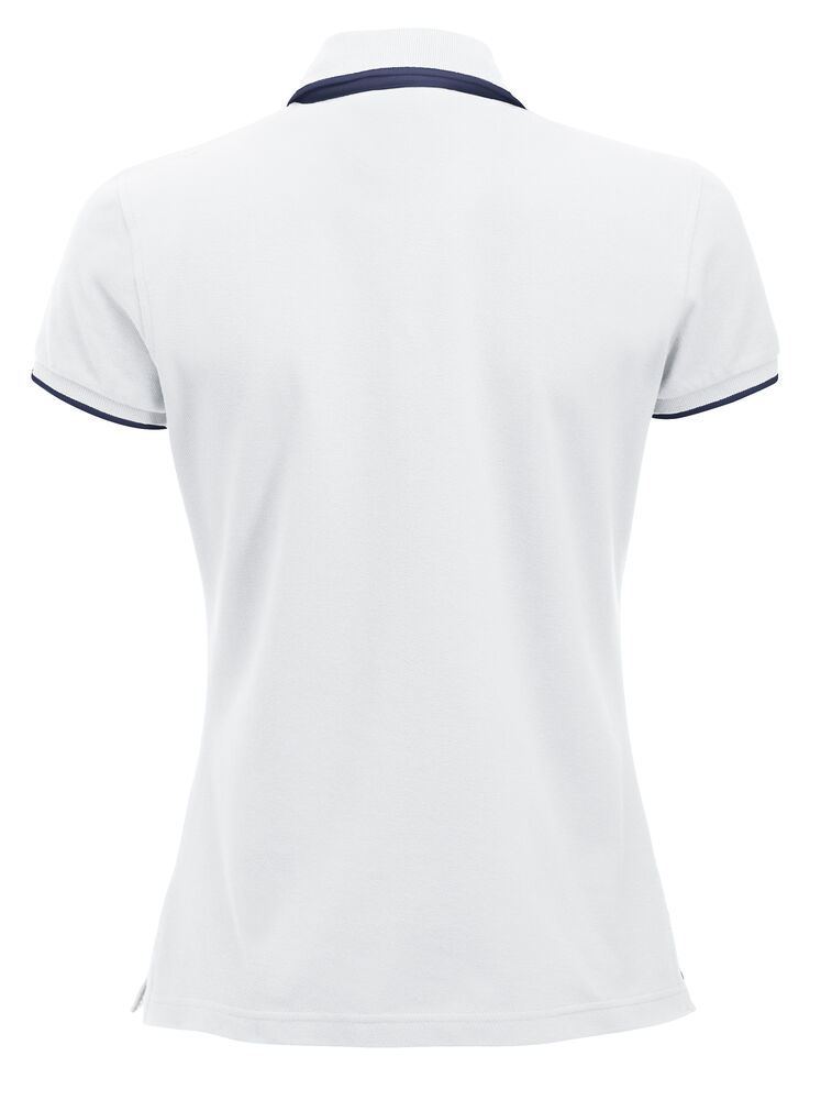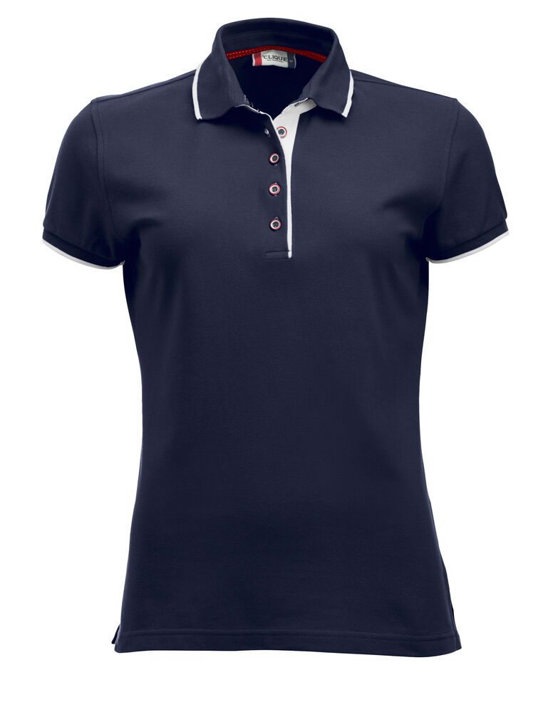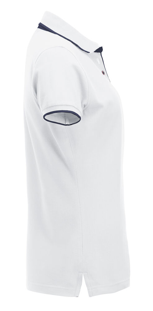 Pique med fargekontrast i knapper, nakkebånd, knappestolpe og splitt i sidene. Stående skjortekrage og knappestolpe med 3 knapper på herremodellen og 5 på dame.Kontraststripe på krage og armavslutning..