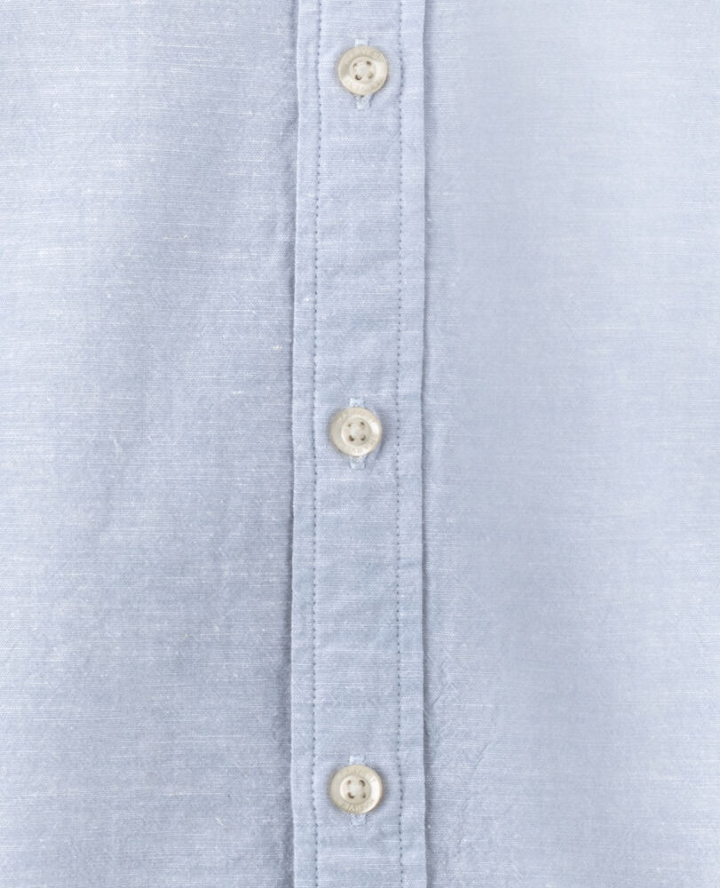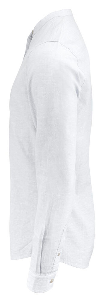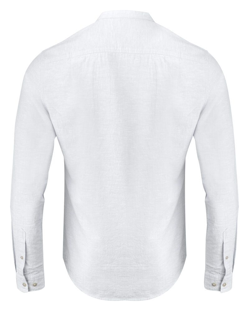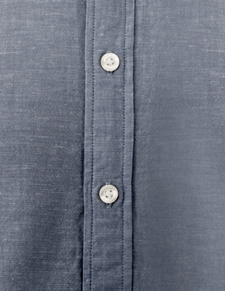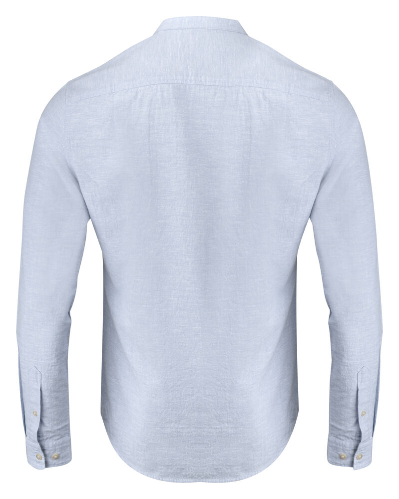 Krageløs skjorte laget av en blanding av bomull og lin. Skjorten har justerbare mansjetter, og er kontrastfarget på innsiden av bærestykket og mansjettene. Perlemor-knapper. Garnfarget.