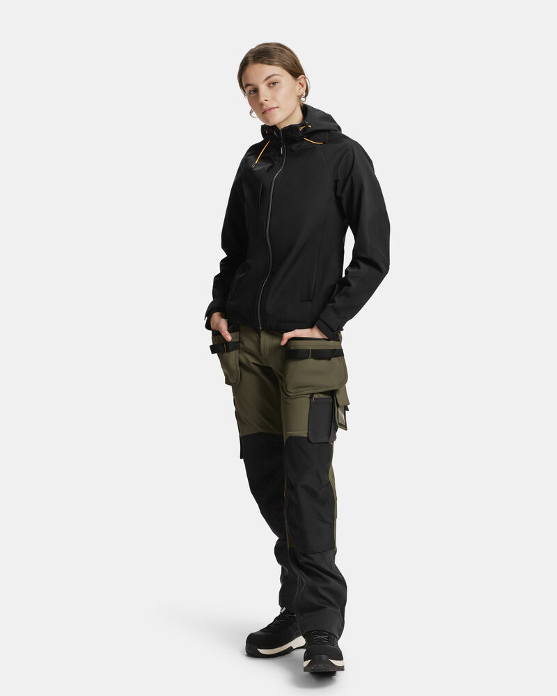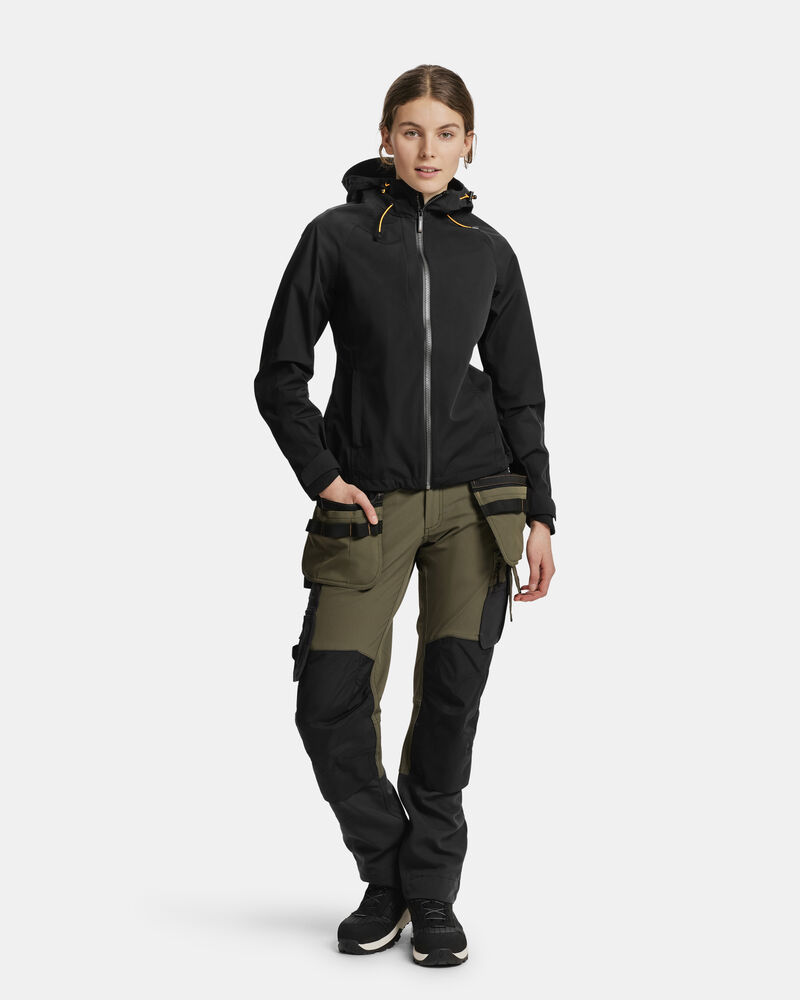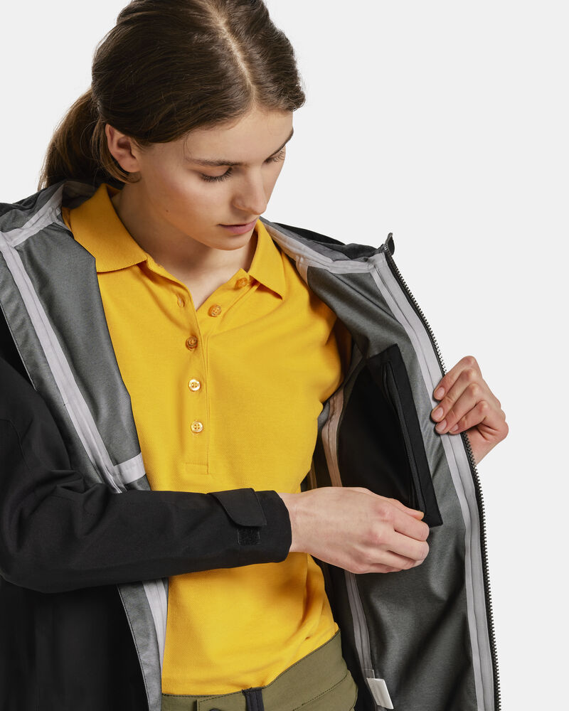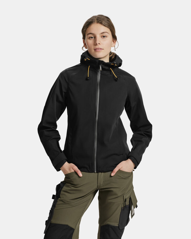 Vanntett skalljakke til dame, med 4-veis stretch og teipede sømmer. Forsterkningsmaterialer/kontrast på ermer og brystlomme. Fast hette, elastisk snøring rundt åpningen. Frontlommer og brystlomme på høyre side foran, med glidelås. Glidelås i front er av typen delrin med vannavvisende zip-teip. Jakken er justerbar med elastisk snøring nederst. Forbøyde ermer. Justerbar ermekant med borrelås. Vannsøyle: 10 000 mm. Pusteevne: 5000 g/m² 24t. Yttertøyet har en fluorkarbonfri BIONIC-FINISH® DWR-behandling.Sertifisert i henhold til Oeko-tex.